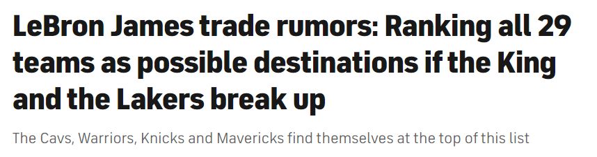 詹姆斯如果离开湖人会去哪儿?从不同角度与类别,CBS体育给29支球队分成8个档次——